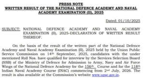 | यूपीएससी एनडीए 2 परिणाम 2025 जारी होगा | 01 October 2025 |
